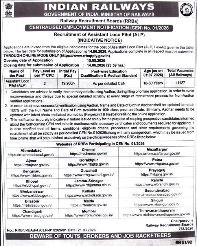 Great news for railway job seekers! The Ministry of Railways has just released the short RRB ALP 2026-27 Notification. This year, they are looking to fill an amazing 11,127 Assistant Loco Pilot (ALP) vacancies across India. If you dream of working in the Indian Railways, this is your golden chance. The online application process starts on 15th May 2026 and ends on 14th June 2026. Keep reading this simple guide to learn about the vacancies, age limits, and who can apply.