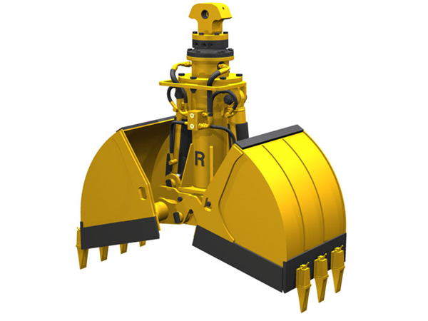The clam-shell bucket is a complex two-piece bucket that is articulated and hinged in the middle, creating a claw-like structure with an internal volume.