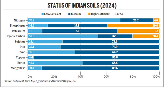 • Micronutrients: Indian soils suffer from deficiency of sulphur (26.4% low/deficient), iron (25.1% low/deficient), zinc (35.8% low/deficient), and boron (41.5% low/deficient).