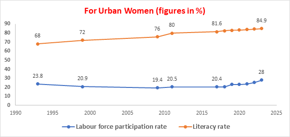 - Education: Higher female literacy and education levels are often prerequisites for increased participation in higher-skilled and formal sectors. The article notes literacy rates for urban women at 84.9% and rural women at 70.4%.